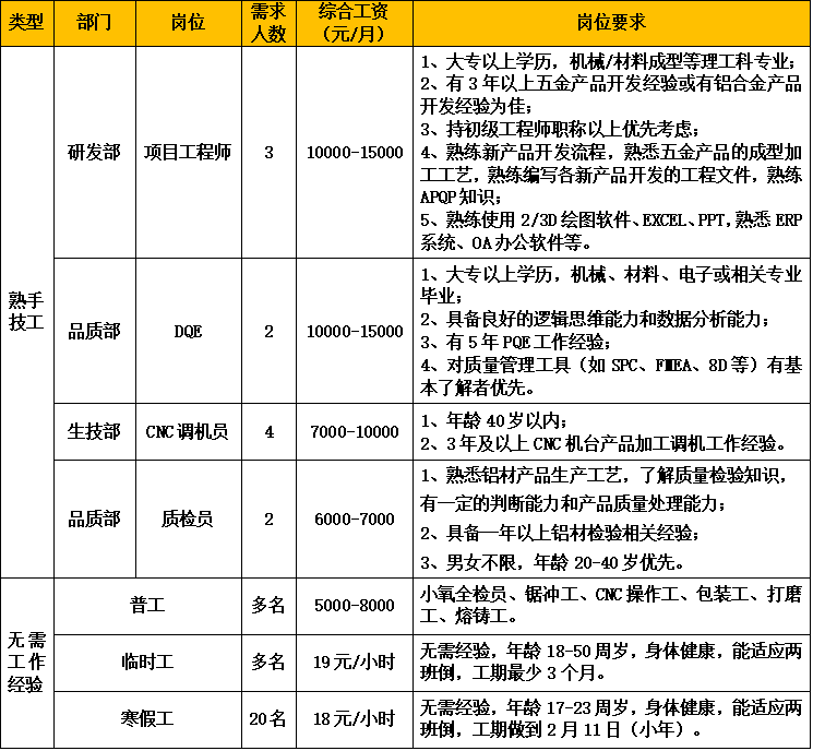 公司擁有廣東省唯一的鋁車體工程技術(shù)研究中心!扳伱冷X材”品牌先后獲得鋁型材行業(yè)內(nèi)的最高榮譽:“中國馳名商標(biāo)”、“中國著名品牌”、“中國名優(yōu)產(chǎn)品”;公司榮獲“國家高新技術(shù)企業(yè)”、廣東省“專精特新”企業(yè)等榮譽稱號。因生產(chǎn)發(fā)展需要,誠聘以下崗位: